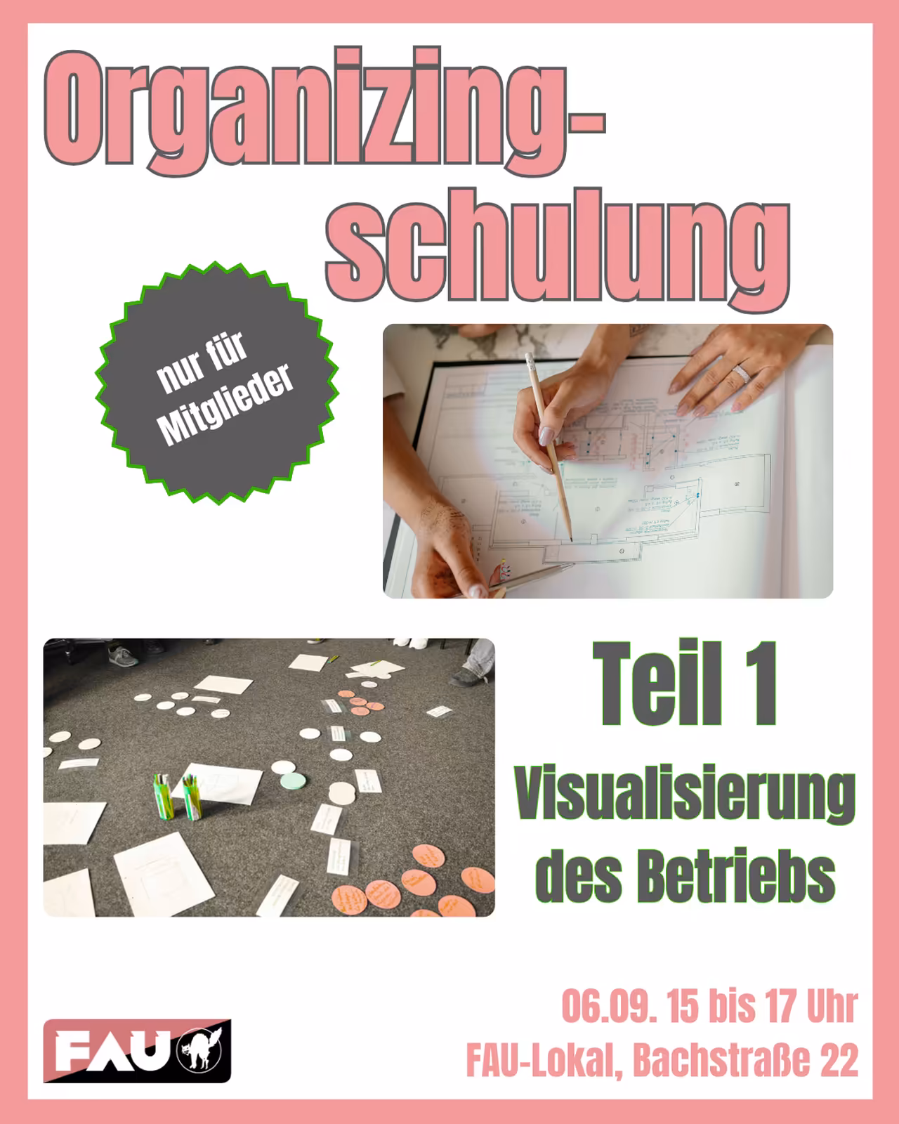 Speziell für Neumitglieder gibt es eine Organizing-Schulung. Dort besprechen wir in drei Modulen, wie wir uns effektiv am Arbeitsplatz mit unseren Kolleg:innen organisieren, um so bessere Arbeitsbedingungen durchzusetzen. Die Schulungen stehen nur Mitgliedern der FAU Jena offen.